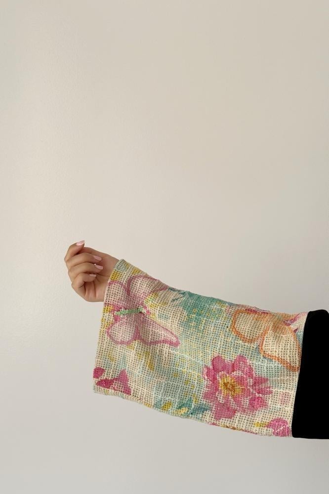 • أكمام مطرزة بشبك ورود تضيف لمسة أنثوية جذابة