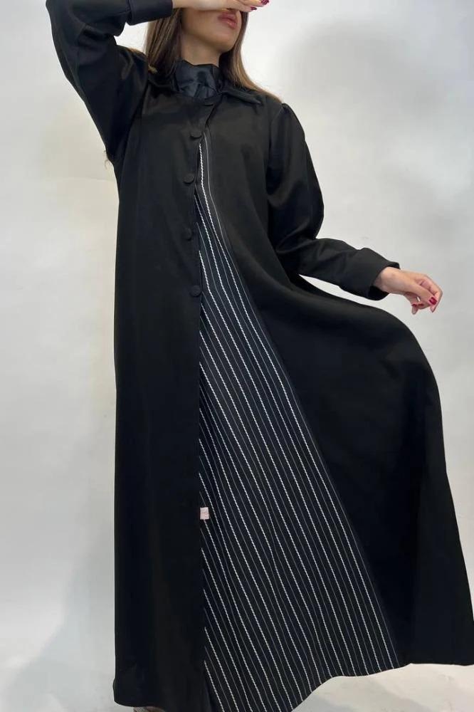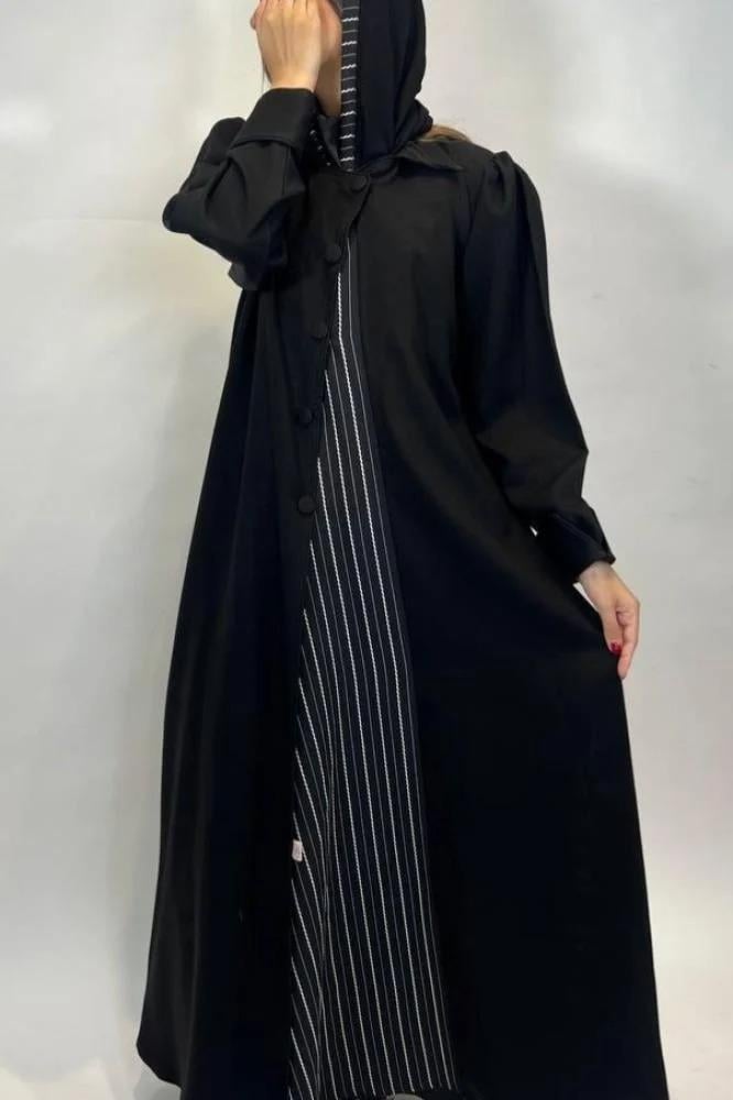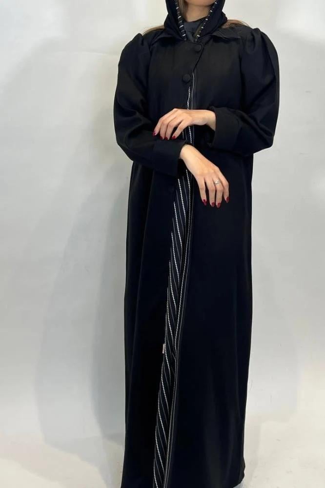 - نمط التصميم عباية واسعة مقفلة بأزرير لمظهر أنيق