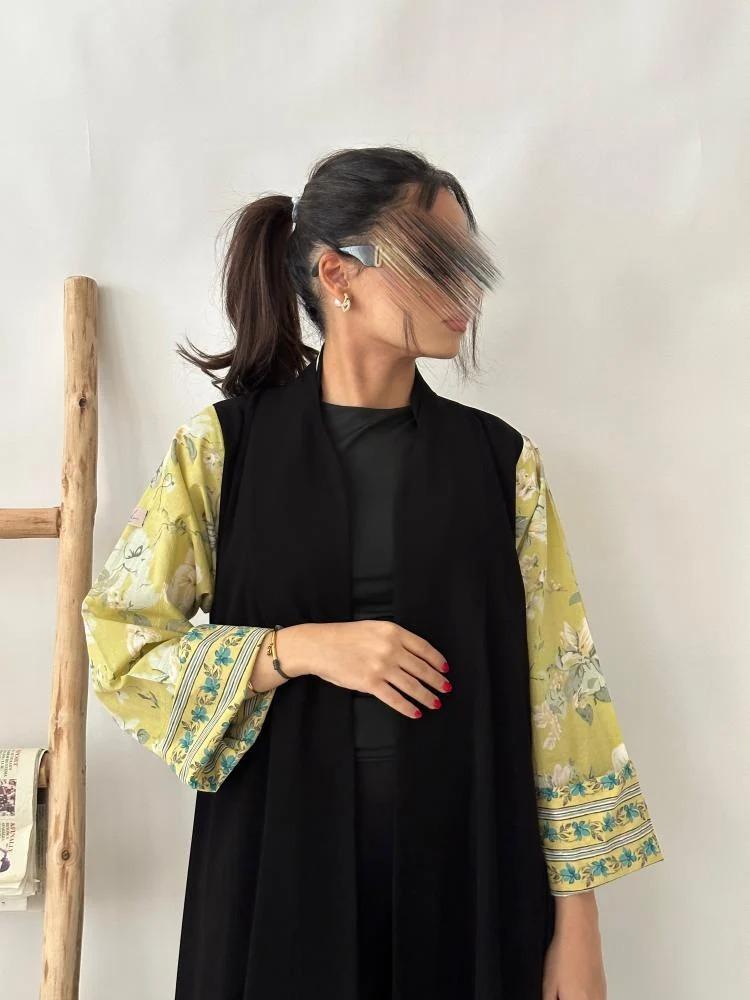 - اللون أسود مع أكمام مطبوعة بالأصفر والأخضر